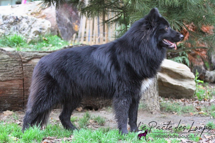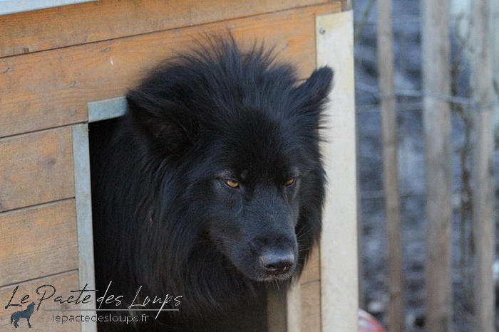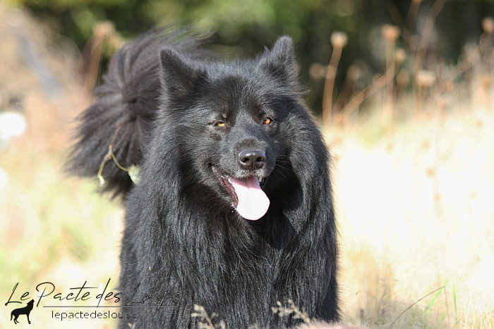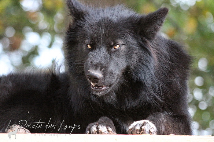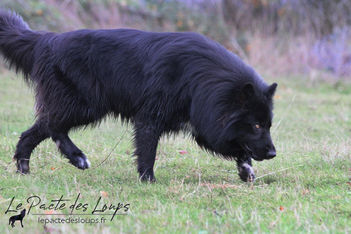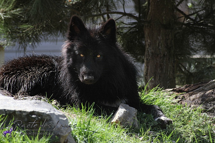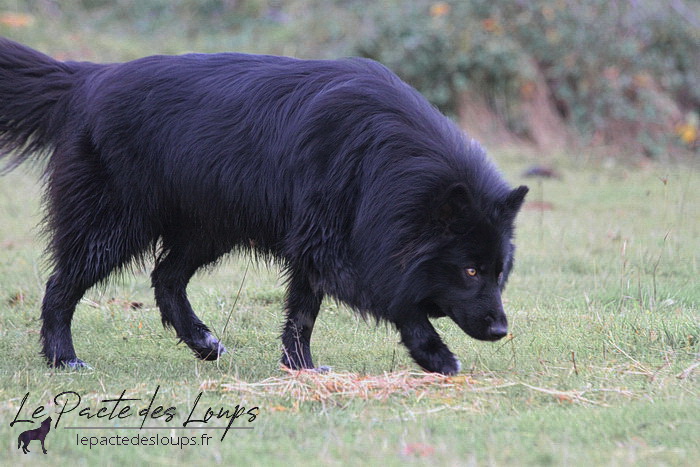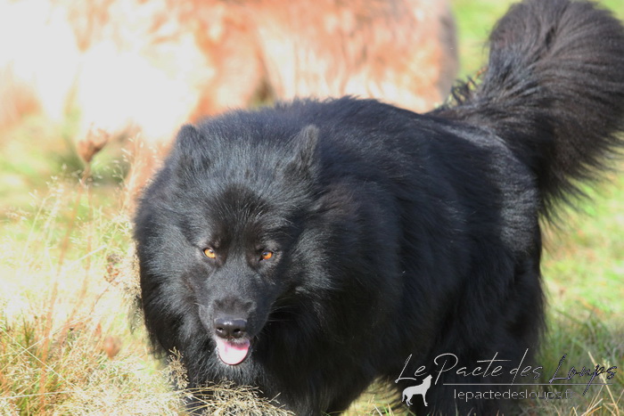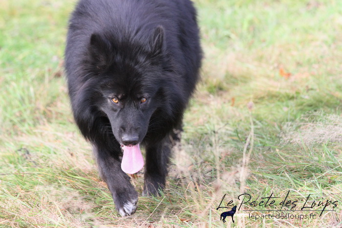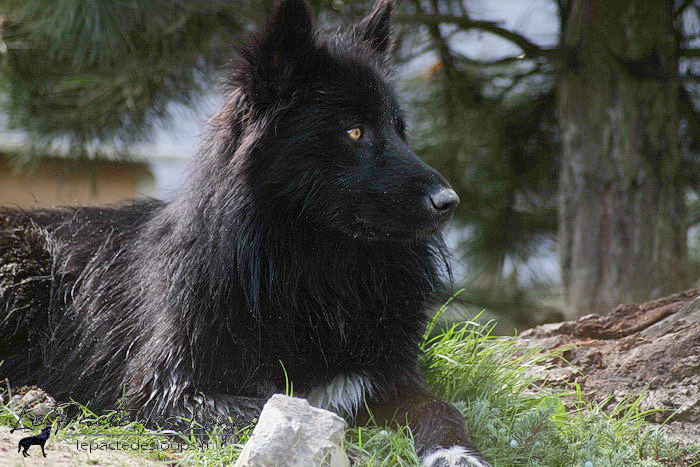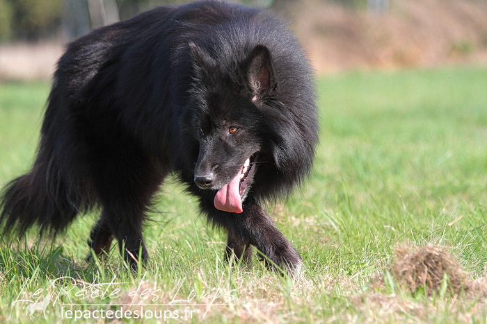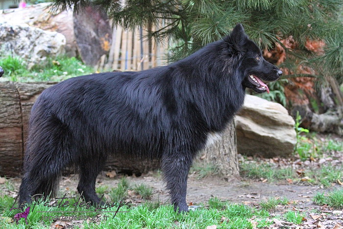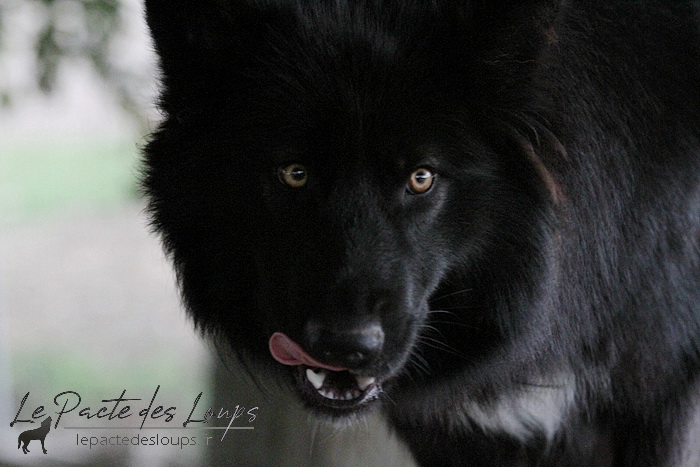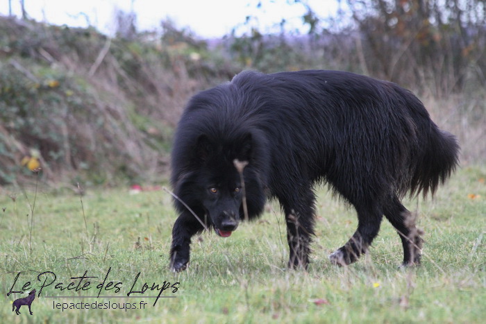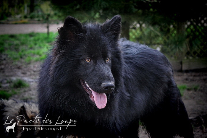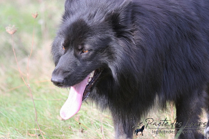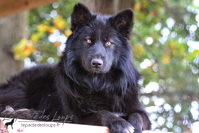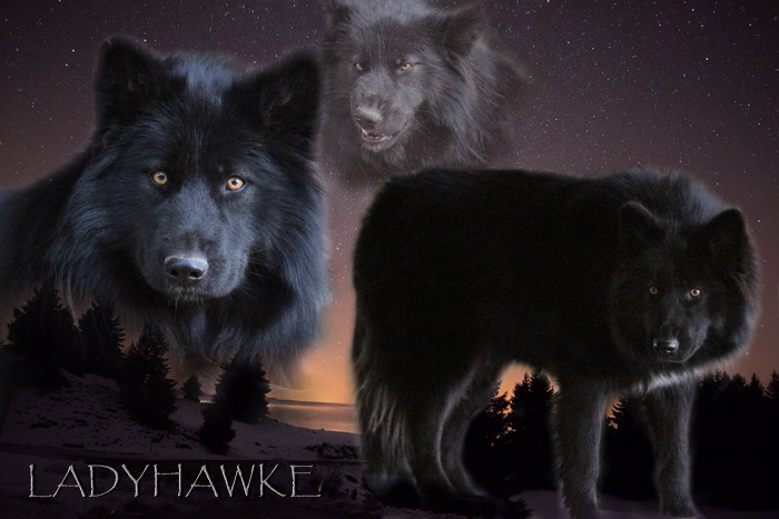 Ladyhawke est une magnifique chienne puissante dotée d'un superbe regard couleur or et d'une robe d'un noir profond très longue et fournie.